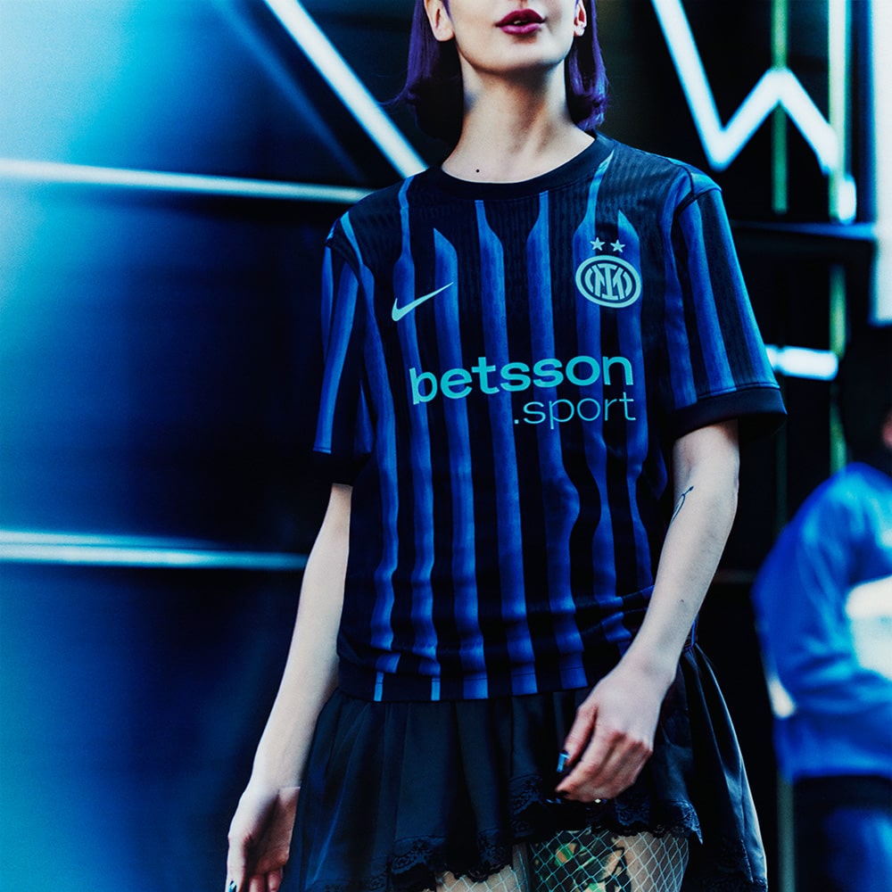 インテル・ミラノの2025/26ホームユニフォームは、クラブと都市をイノベーションの中心地として讃えるデザインです。ブラックを基調に、有名なミラノデザインウィークの未来的な光のインスタレーションに着想を得たアーティスティックな「Inter」スクリプトをあしらいました。
