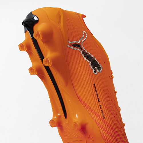 ●丸形のスタッドの配置で地面からの突き上げを軽減。また、最前部に配置した、FastTraxSTUDと同仕様のスタッドは、加速時の最後の蹴り出しをサポート。人工芝のグランドにおいても、最後の一蹴りで力を発揮する。また、中足部まで伸びたシャンクが安定感をもたらしつつ、蹴り出し時の反発を生み加速をサポートする。