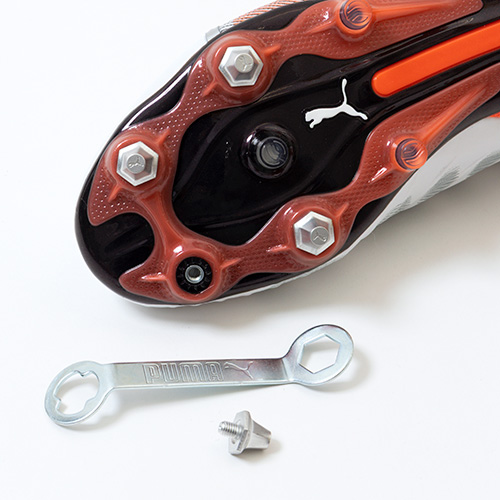 ●PebaxナイロンとPUで形成される軽量アウトソール。丸形のスタッドは様々動きにグリップ力を発揮し機動性を高める。中足部に配置されたシャンクが中足部の捻じれを抑制し力の分散を抑える効果をもたらす。アウトソールと一体となったヒールカウンターで踵のフィット感を高め、キック時の踏込みの安定感、様々なステップワーク時の踵のブレを抑制しする。6本取替えスタッド+5本固定スタッドのミックスソールを採用。