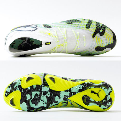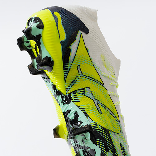 ●3D仕様のパフプリント加工でセットされたフュージョンポッズ。フュージョンスキン上に独立した形で配置されており、ダイナミックな足の動きに適応し、キッキング時のボールタッチをサポートします。