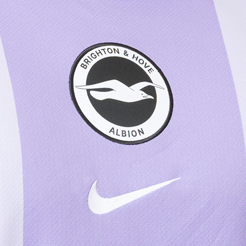キットラインナップに新色、デュアルトーンパープルが登場。2025-26アウェイシャツは、中央とサイドに太い大胆なストライプが入ります。背面は無地で、袖口はより大胆なカフスで縁取られています。中央にBHAFCのエンブレムとナイキのスウッシュを配置することで、今シーズンならではのユニークなルックが完成します。関連商品