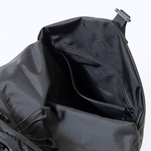 ●フロントポケットはマチを設けることで収納力抜群。スポーツで使用するウェアなど嵩張るアイテムを収納し、トップに設けたバックルで留めることが可能。センターのウェビングテープ裏にもジップポケットを完備し、使用頻度のたかい小物類などを収納するのに便利。