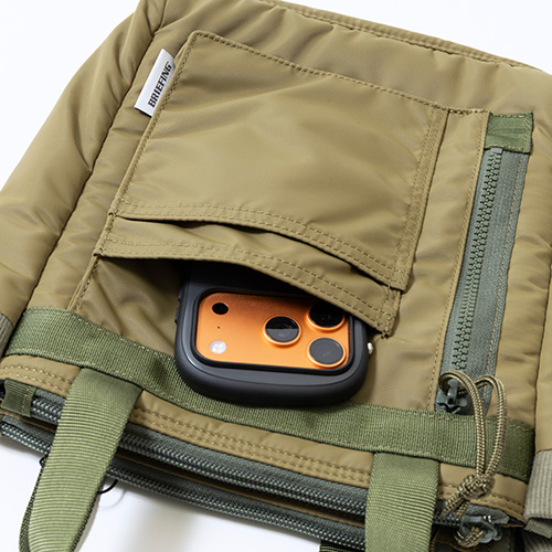 ●フロント側・背面側の収納部はクッション材を完備。デリケートな貴重品やスマホはもちろん、小型のタブレットなどを収納するのに便利。