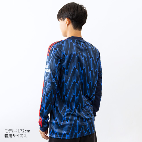 - プレミアリーグ(イングランド)アーセナルFCの2025-2026シーズン AWAYモデル 長袖ユニフォーム(サポーター着用モデル)。