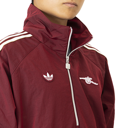 1980年代のサッカー文化を体現した、adidasのアーセナルジャケット。特徴的なハーフジップの両側に配されたトレフォイルロゴと大砲のエンブレムのディテールが、レトロなルックを演出します。
