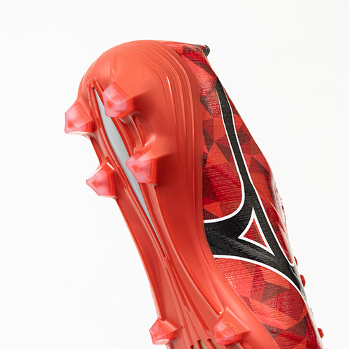 ●基本的なスタッド配置はMORELIAシリーズを参考にしつつ、より縦へのスピードやクイックな動きを実現するための「トライアングルスタッド」を採用。踵部分は高反発ソール素材(MIZUNO ENERZY)を使用することで、クッション性が向上し、ハードワークに貢献。